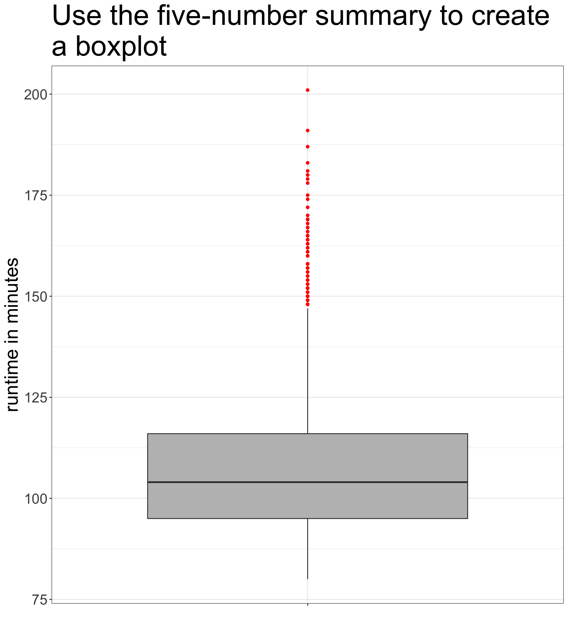 To calculate the percentile with this command, we need to add a second argument called probs where we feed in a list of proportions. So if we wanted to calculate the 13th and 76th percentile of movie runtime: