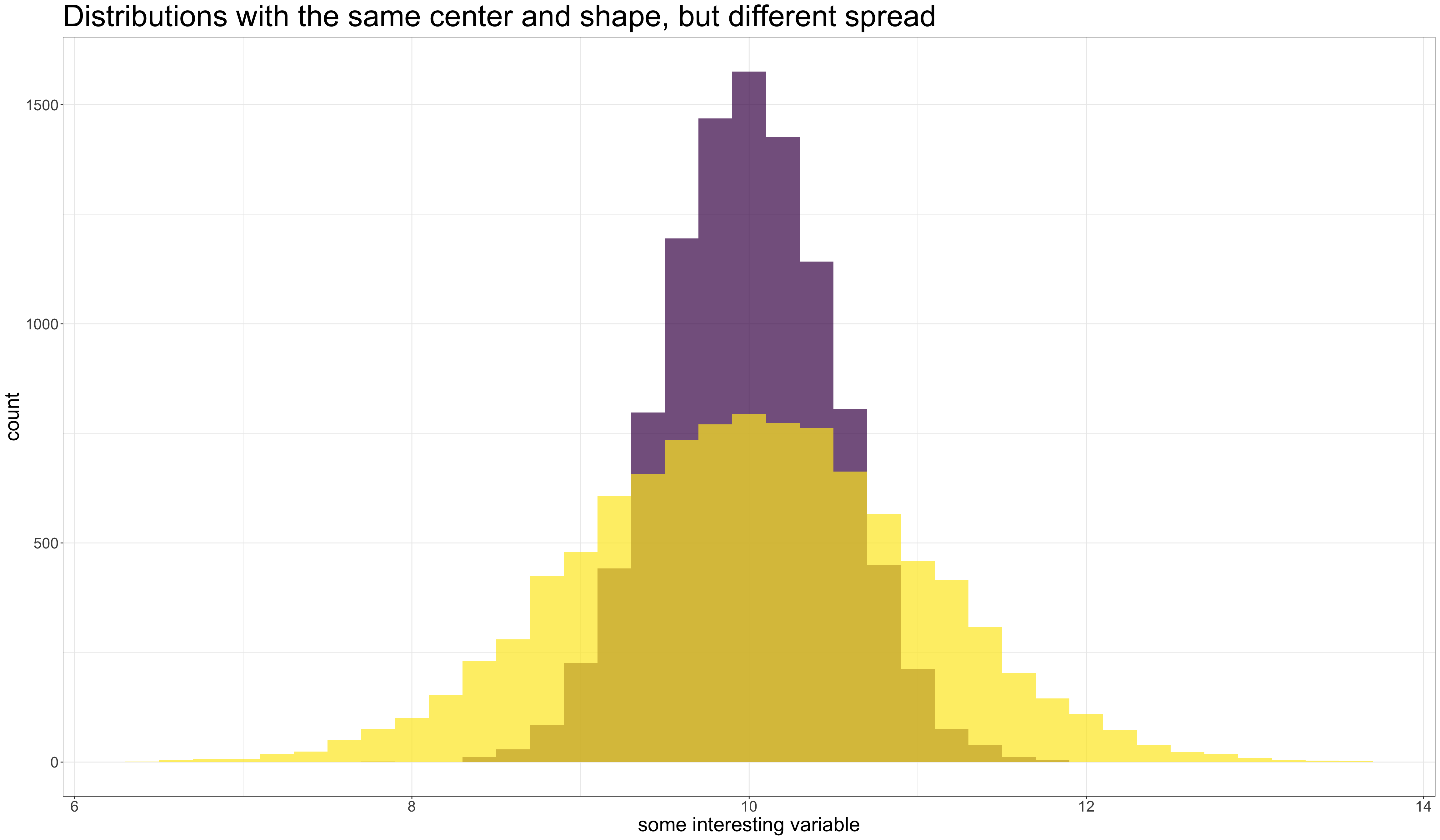 Standard deviation (SD) is the most common measure of spread in a variable. Loosely, standard deviation measures the average distance from the mean of all observations. Variance is the squared value of standard deviation.